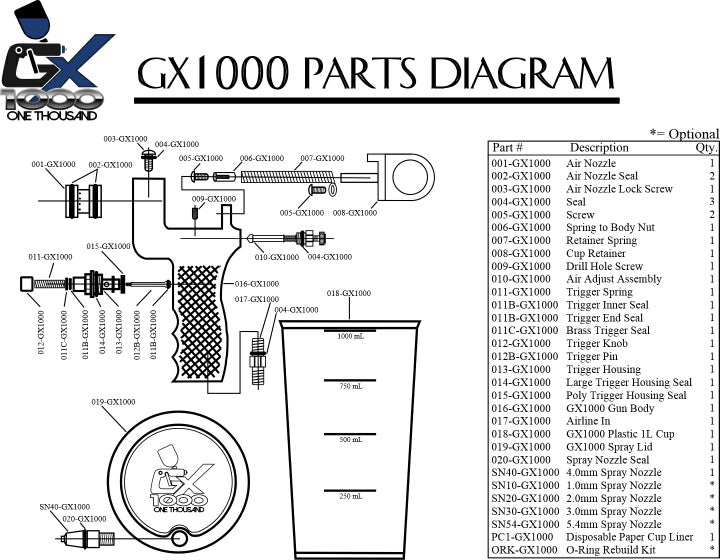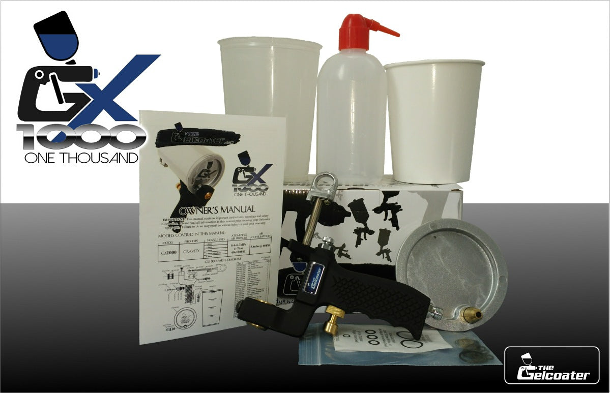The GX1000 gelcoat spray gun comes standard with a free set of replacement o-rings (A $20 value!), a 5.4mm nozzle, aluminum spray gun lid, an owners manual featuring operation and care instructions for everyone from beginner to professional users, a 1000mL heavy duty polypropylene cup, a 32oz disposable paper cup liner and a squirt bottle for catalyst or cleanser dispensing.